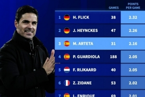 體育資訊1月21日訊 德轉(zhuǎn)盤點(diǎn)了自92/93賽季歐冠改制以來,至少帶隊(duì)25場的主帥中場均積分榜,其中弗里克居首,具體如下: