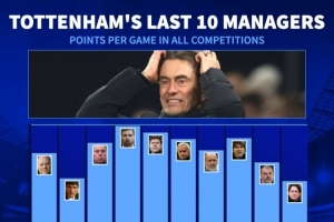 據(jù)德國轉(zhuǎn)會市場統(tǒng)計,弗蘭克執(zhí)教熱刺各賽事場均僅拿到1.32分,近10任熱刺主帥場均積分最少。