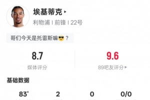 體育資訊2月1日訊 英超第24輪,利物浦主場迎戰(zhàn)紐卡斯爾。?;倏耸装l(fā)出戰(zhàn),6次射門4次射正,貢獻雙響,也錯失2次進球機會,評分8.7。