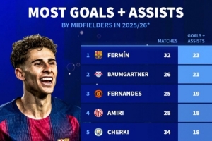 體育資訊2月24日訊 《轉會市場》統(tǒng)計了本賽季五大聯(lián)賽中場球員在各項賽事直接參與進球情況,費爾明領跑。