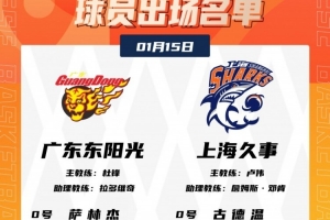 體育資訊1月15日訊 今晚19:35,廣東將在主場(chǎng)迎戰(zhàn)上海,賽前大名單出爐。