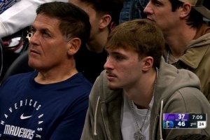本場比賽因左腳踝扭傷缺戰(zhàn)的弗拉格來到了現(xiàn)場,并坐在球隊小老板庫班身邊觀看比賽。