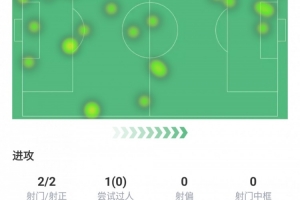 評(píng)分7.8,出場(chǎng)95分鐘,進(jìn)球1個(gè),射門2次、射正2次、嘗試過(guò)人1次