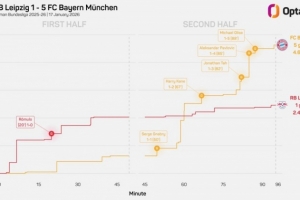 數(shù)據(jù)統(tǒng)計顯示,拜仁上次在德甲聯(lián)賽客場半場落后情況下在下半場打進5球,還是1976年9月:半場0-3波鴻,最終6-5獲勝。