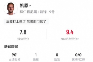 體育資訊1月18日訊 拜仁在本輪德甲5-1逆轉(zhuǎn)萊比錫,凱恩本場數(shù)據(jù)如下: