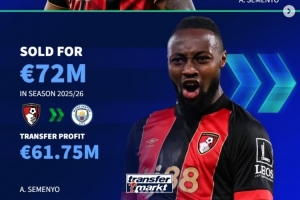 體育資訊1月10日訊 曼城已經(jīng)官宣簽下塞梅尼奧,《轉(zhuǎn)會(huì)市場(chǎng)》統(tǒng)計(jì)顯示這也是伯恩茅斯近年來(lái)通過(guò)轉(zhuǎn)賣盈利最多的一筆交易(單位:歐元)。