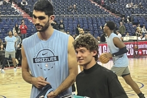 賽前,灰熊內(nèi)線阿爾達(dá)馬和梅奔F1車手安東內(nèi)利兩人交換了球衣。