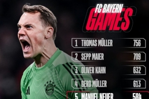 拜仁官方曬隊(duì)史出場(chǎng)次數(shù)榜:諾伊爾584場(chǎng)追平貝肯鮑爾并列第5